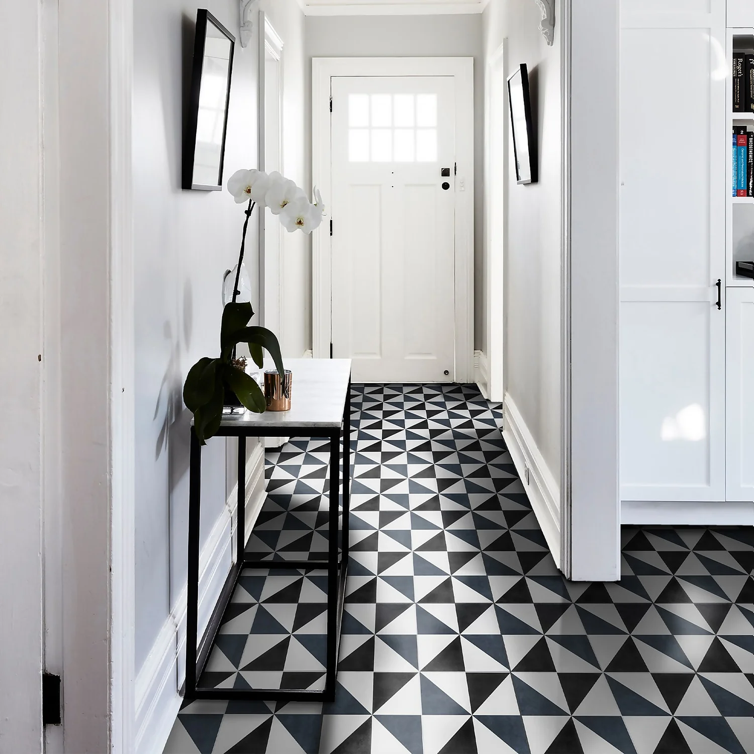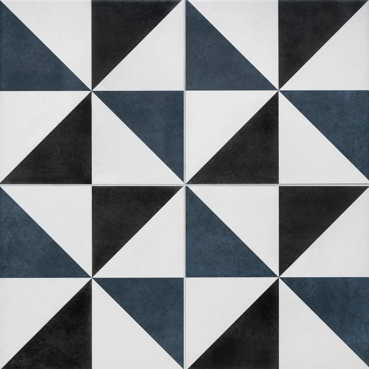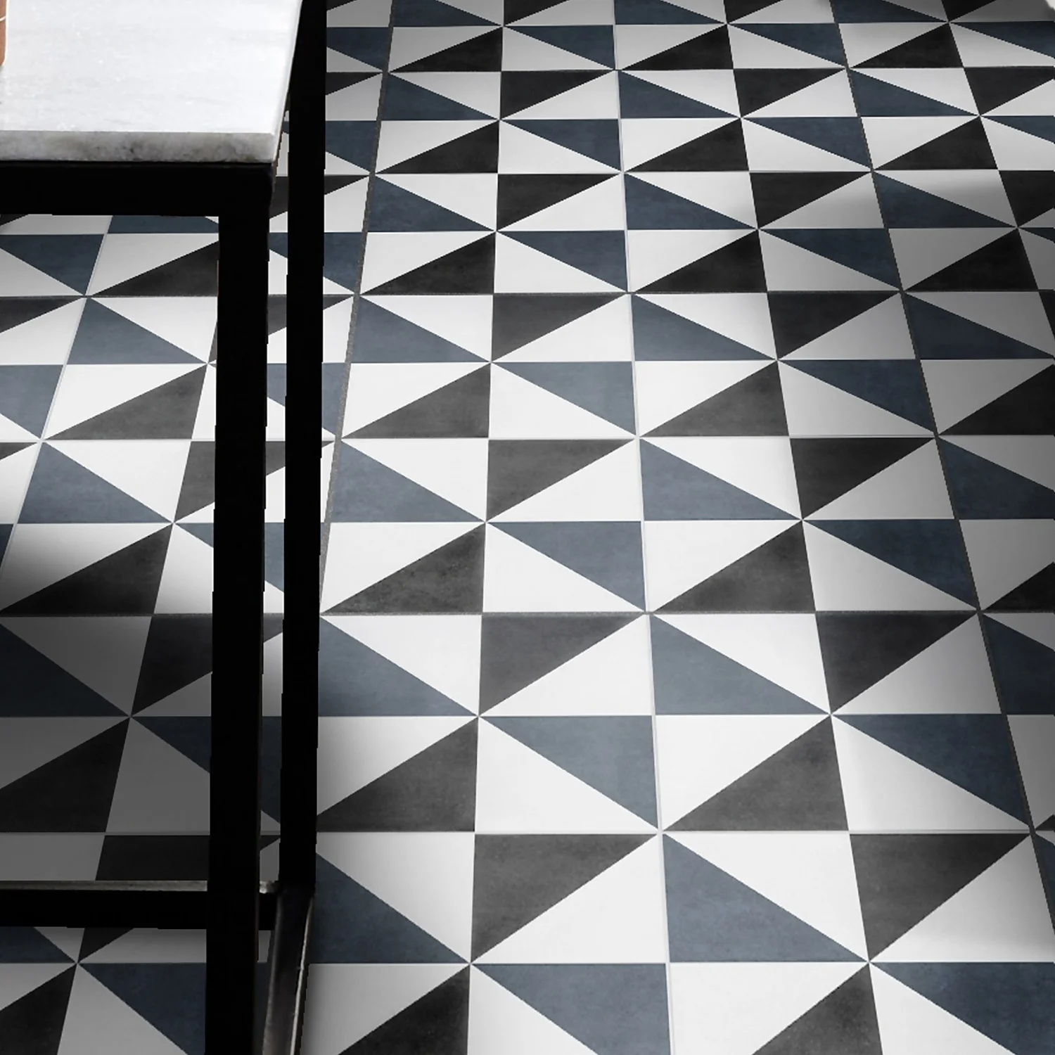 This House Beautiful tile is a larger format tile from their Cube collection. Windmill boasts a black, white and blue smaller scale ‘half and half’ pattern. These tiles feature an encaustic effect, which creates a chalky like matt finish. Each tile has pre-scored lines that create the effect of four smaller tiles, but make installation much easier. They’re both beautiful and practical. Monochromatic colours make it easier to create inspiring feature walls or floors. The durability of porcelain makes these tiles suitable for any space in your home, including high-traffic areas. Windmill makes achieving the half and half look much easier as the pattern is ready to go, all you have to do is install it!